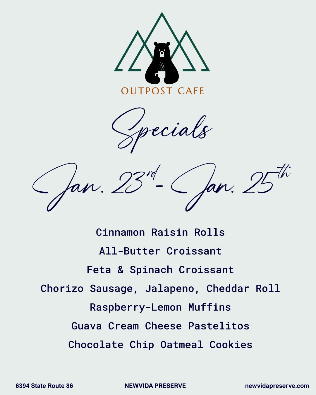 At Outpost Cafe, enjoy a thoughtfully curated selection of fresh morning delights available Friday through Sunday from 8am to 12 pm. Sip on expertly crafted coffee and espresso drinks, from classic americanos and lattes to rich cortados and refreshing cold brews, with a variety of milk and flavored syrup options. Fuel up with savory bites like the Havana Burrito, Trailblazer and Black Diamond sandwiches, or lighter options like savory tartlets and chorizo sausage rolls. Sweet cravings are met with tempting treats such as pastelitos and fruit tarts. Refresh with cold drinks including orange juice, iced tea, and lemonade—perfect companions for your morning visit to NewVida Preserve.